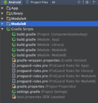 ModuleA和ModuleB是相对独立的业务模块,可以分别进行开发,编译时只编译自身,具体实现时在gradle.properties中设置变量,如:IsBuildMudle=false