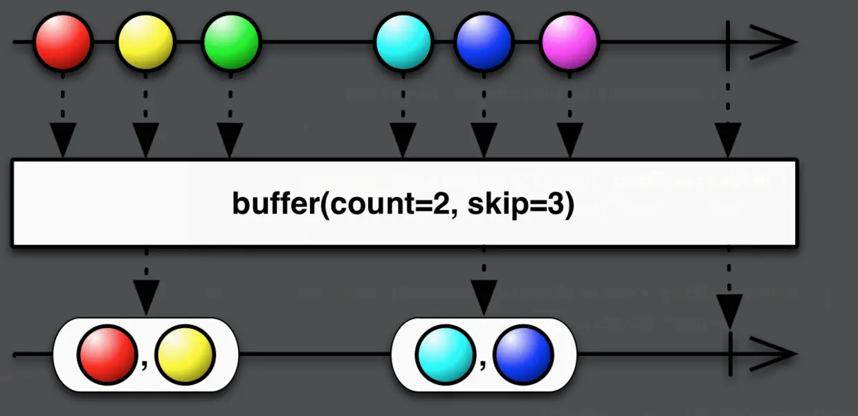 图示中就是每次buffer 2个数据之后emit,每次emit之后跳过3个数据。