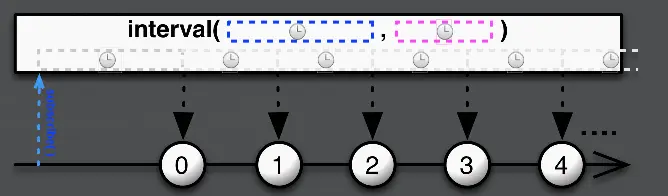 Observable.interval(0, 2, TimeUnit.SECONDS);interval可以延时一定时间后开始按周期emit数据,emit的数据从0开始一次递增。