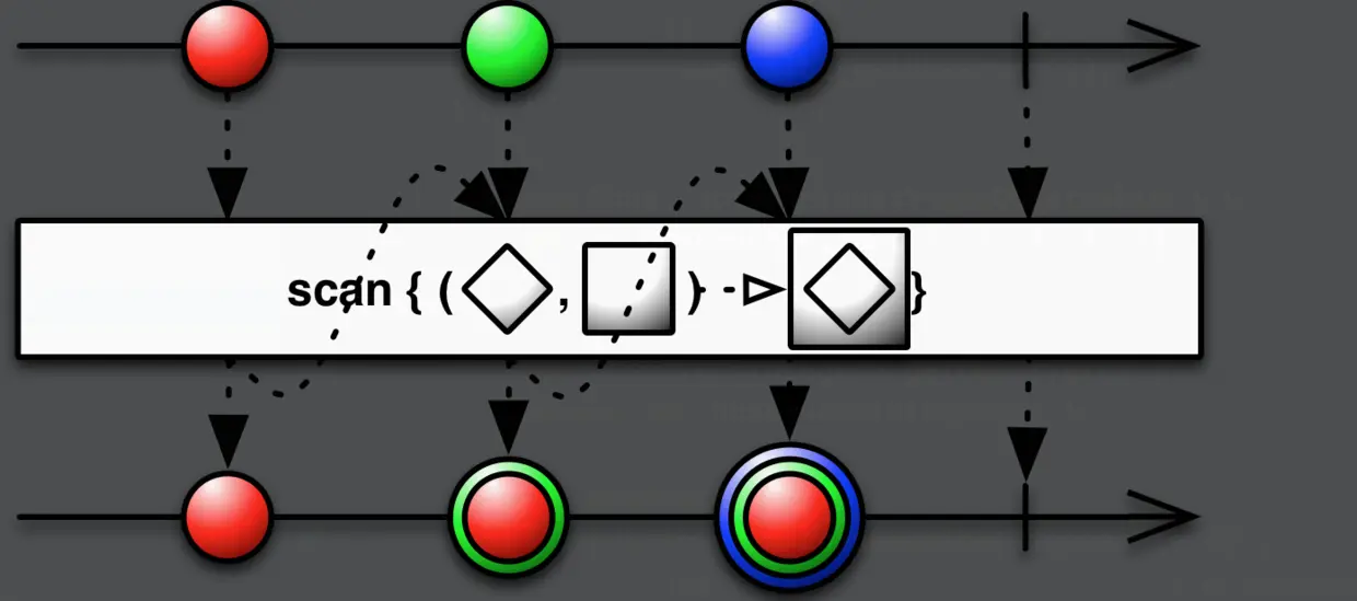.subscribe(getObserver());demo中依次输出1,3,6,10,15,即依次把BiFunction作用在前一个输出结果和当前数据上。