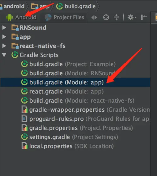 include ':app' include ':react-native-fs' project(':react-native-fs').projectDir = new File(settingsDir, '../node_modules/react-native-fs/android') include ':RNSound', ':app' project(':RNSound').projectDir = new File(rootProject.projectDir, '../node_modules/react-native-sound/android') - 在build.gradle中添加: