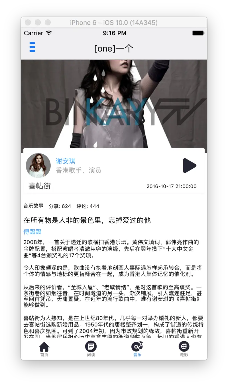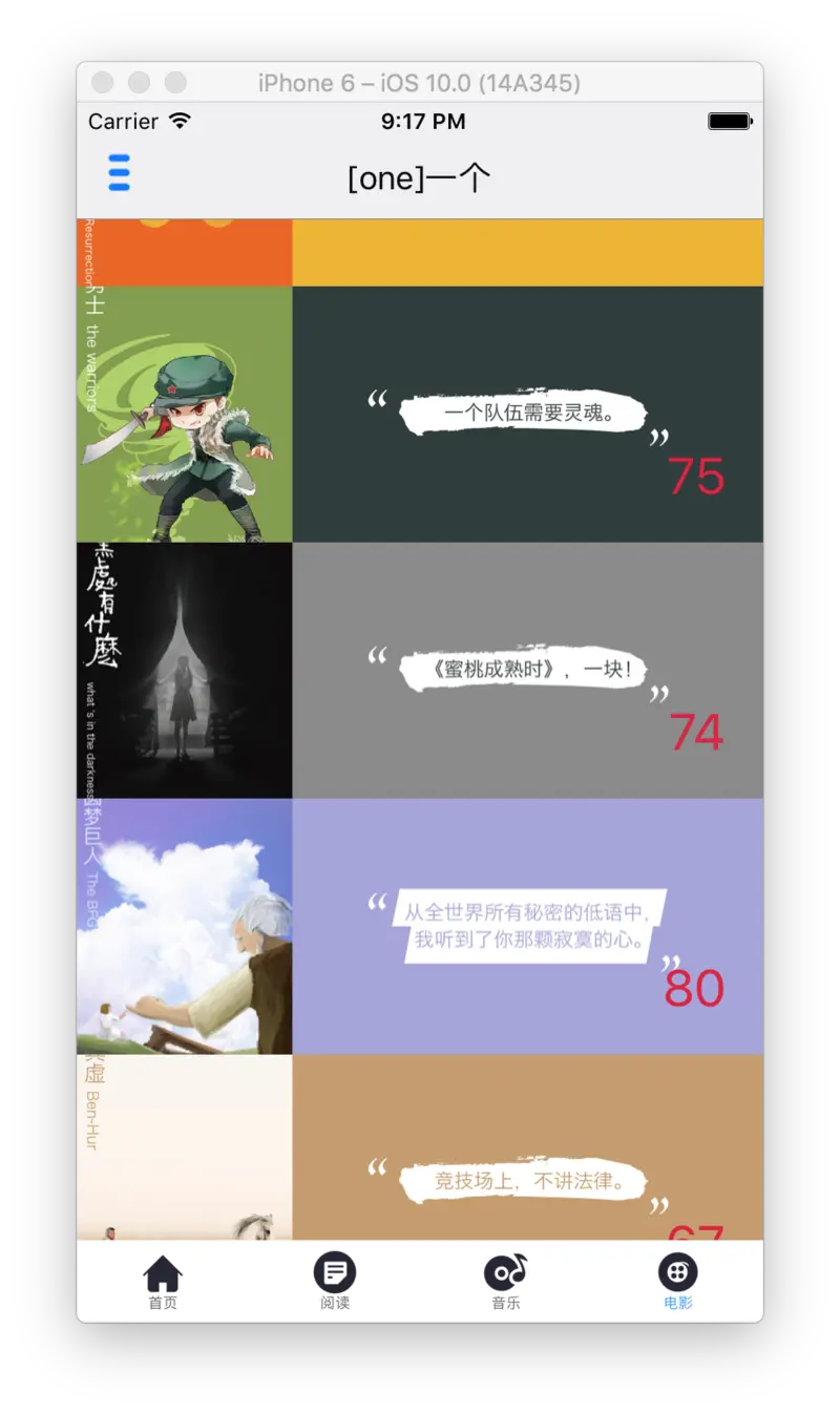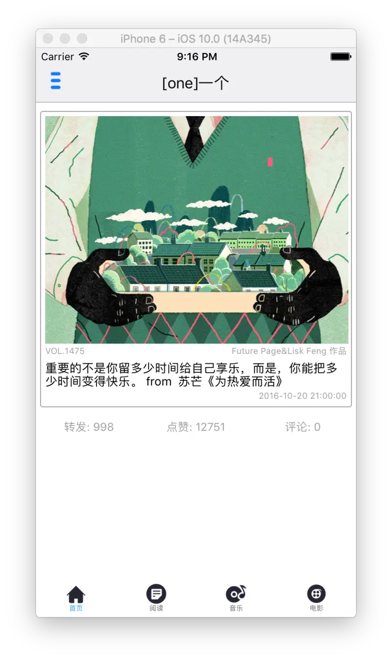 目前项目完成了(One 【一个】)主体界面功能,当然功能和原App还有较大的差距,之前主要对ios进行了适配,这两天对Android也进行了一些调整。有什么bug大家可以评论或者在github上提issue。先看一下效果图: