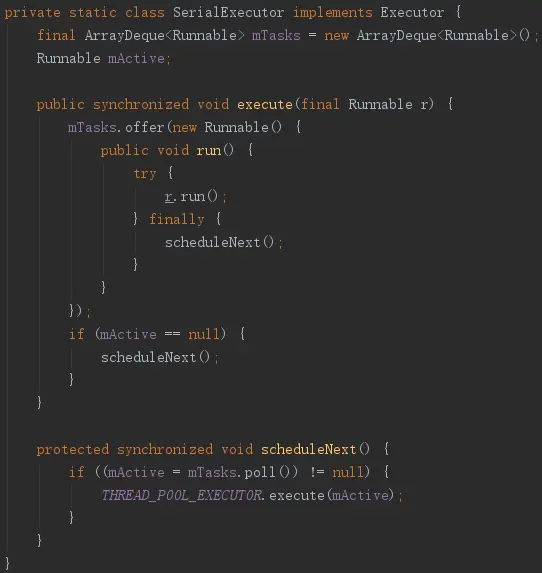 如果用AsyncTask.execute(params...)方法来执行任务,就会用到默认的线程池,即SERIAL_EXECUTOR;可以看出SERIAL_EXECUTOR会让所有的线程串行执行:
