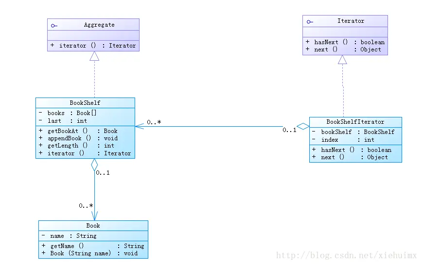该类就是表示书架的类,该类有一个数组books用于存放书籍,并提供了获取数据,添加书籍及书籍数量的方法,由于实现了Aggregate接口,则需重写iterator方法,该方法返回BookShelfIterator类的实例作为该类的iterator。当外部想要遍历书架时就调用这个方法。