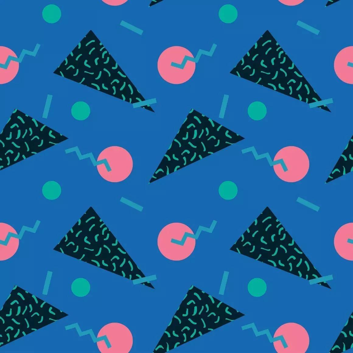 2.图案:这里可能会有一些棘手。跟先前的设计运动不同,孟菲斯在设计背景中采用了凌乱和自由的方式。不难发现细瘦、笔直的线,与有机、大量的点和3D结构图形,形成了鲜明的对比。用玩具或游戏来思考会非常有帮助。