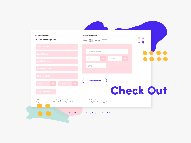 UI设计:孟菲斯设计风格的精髓是:几何学和色彩的应用,被应用在这个付款流程的界面设计中。