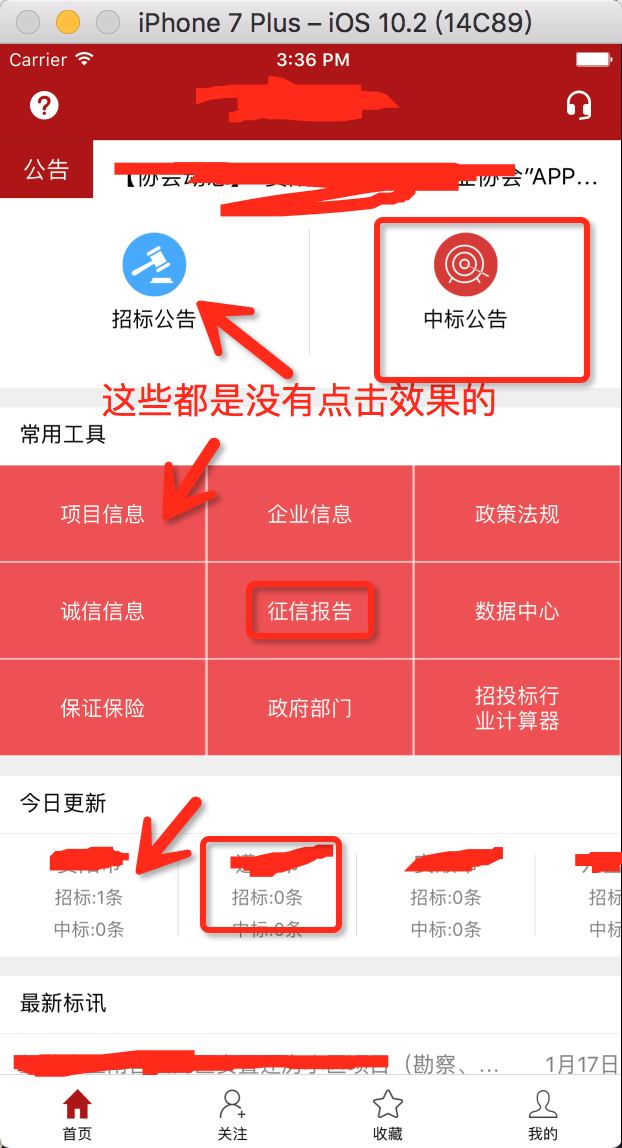 下面图片可以看到,框框内的都是按钮,有些原程序使用的是图片加lable再实现tap手势,反正都没有点击效果,整个页面反而很像H5实现的(因为是在是不知道自己点击了哪里);首页是一个UITableView视图。这些按钮都是添加在cell上的。对于上面按钮中的图片和字都是水平居中,上下排列,后面会重新写一篇聊聊怎么实现的。