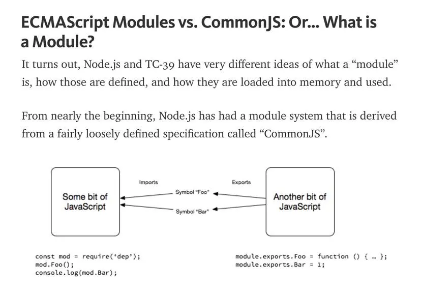 图片上文字翻译如下: 事实证明,Node.js和TC-39对于组件的相关问题有很大的分歧:什么是,如何定义,以及他们怎样被载入内存和使用。 从最开始,Node.js已经有一套起源于CommonJS,相当宽松的组件系统。