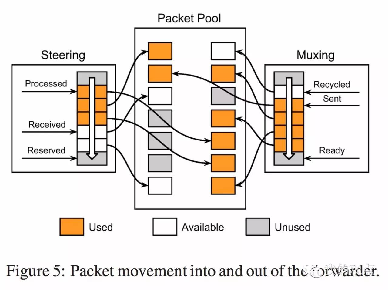 前几天听美团的介绍他们的负载均衡器是用的类似的思路用 DPDK 直接在网卡上编写应用,性能相对 LVS 就有数倍的提升。看 Maglev 的实现为了榨干性能是直接写在网卡上的,都没有 DPDK 之类的封装。绕过内核就可以自己分配内存管理内存就可以进一步的压榨性能。论文中可以看到 Maglev 是直接和网卡共享内存的,这样就不需要将数据包再从网卡进行一次复制到负载均衡器中,也不需要把数据包再从负载均衡器复制到网卡,网卡入口队列,负载均衡器,网卡出口队列共享一个数据池空间,三个指针不断的移动处理数据包,可谓是在内存这里做到了极致。