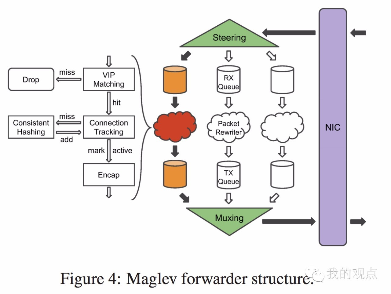 简单的说虽然 LVS 已经做到 Linux 内核里了,但是在 Google 看来 Linux 是性能的瓶颈,到 LVS 之前还要经过完整的 TCP/IP 协议栈以及内核的一系列 filter 模块,而这些对于转发来说是没有必要的。于是 Google 的做法就是简单粗暴的绕过内核,把 Maglev 直接架在网卡上对接网卡的输入和输出队列,来一个数据包也不需要完整的 TCP/IP 协议栈的解析,进来的包只要分析前几个字节,拿出源地址,源端口,目标地址,目标端口和协议号这个五元组对于转发来说就已经足够了。剩下的诸如 payload,序列号之类的东西统统不关心直接塞到网卡输出口给后面就行了。