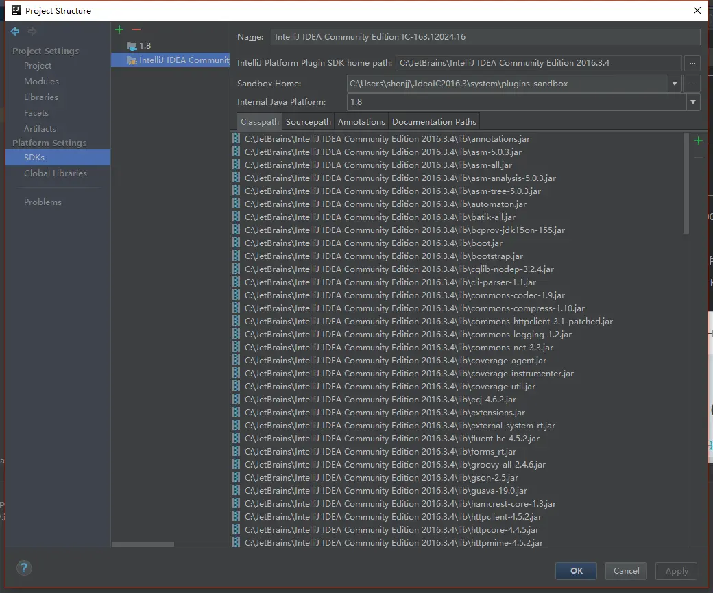 3.项目右击->Open Module Settings->SDKs 选择Intellij安装目录