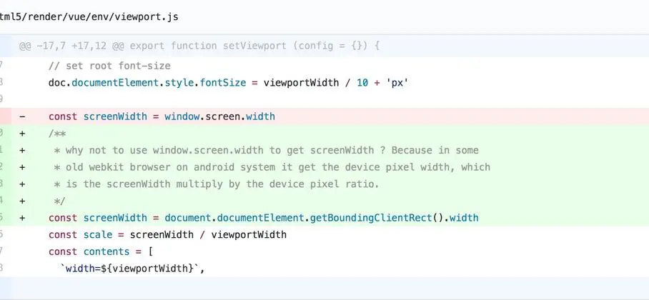 我们直接看源码修改的部分,这里将window.screen.width修改成了document.documentElement.getBoundingClientRect().width