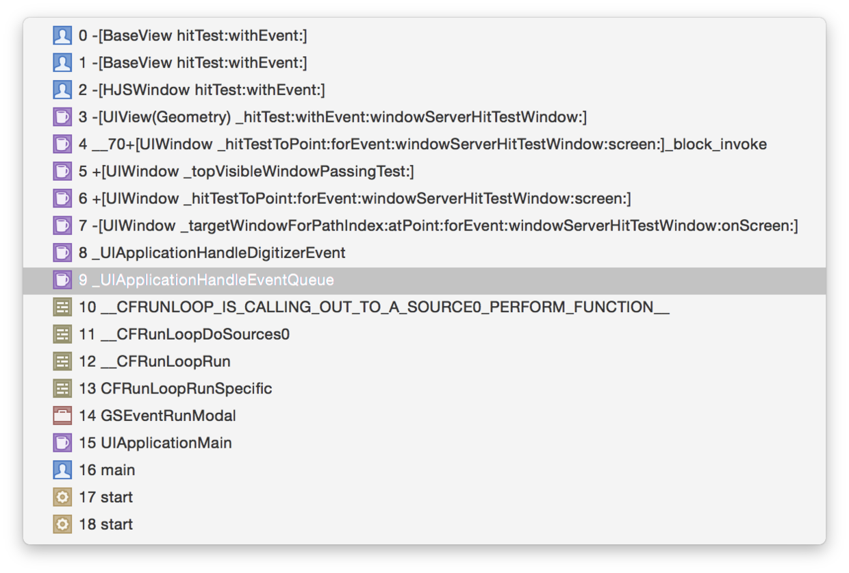当把断点打在某个UIViewhitTest(_:with:)中时,对应的调用堆栈如下: