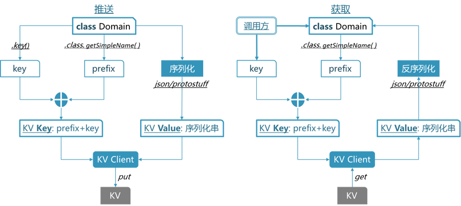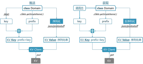 反序列化:在线服务根据key和Domain.prefix从KV中得到序列化串,并反序列化为Domain对象。