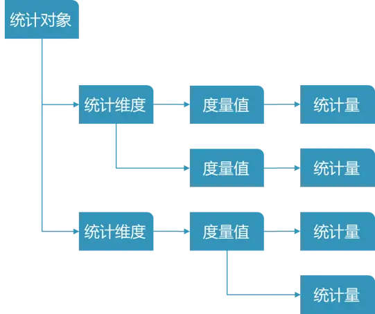 同一对象,可统计不同维度;同一维度,有不同的度量角度;同一度量角度,有不同的统计方式。如下图: