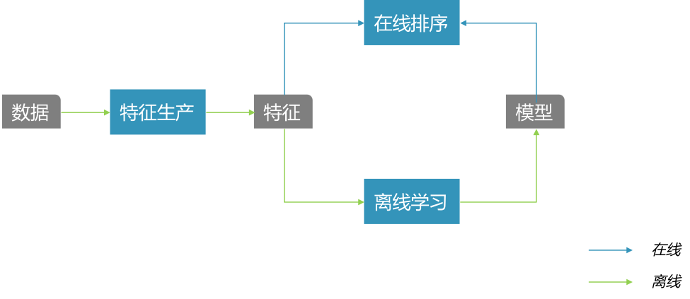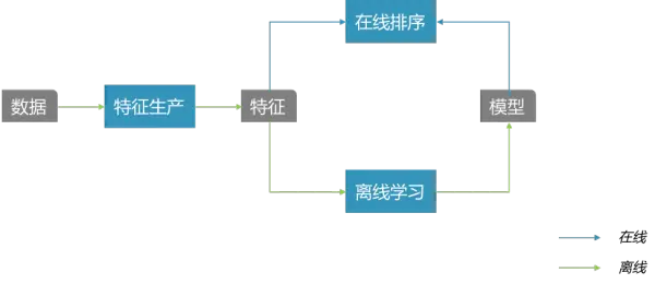 外卖排序系统使用GBDT(Gradient Boosting Decision Tree)树模型,比较复杂。受限于计算能力,除了上下文特征(如时间、地域、终端类型、距离等)之外,目前使用的主要是一些宽泛的统计特征,比如商家销量、商家单均价、用户的品类偏好等。这些特征的生产流程包括:离线的统计、离线到在线的同步、在线的加载等。
