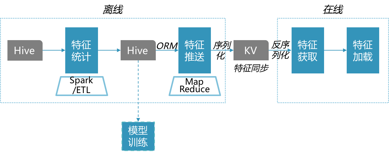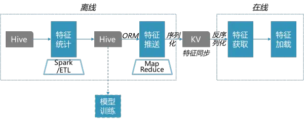 特征统计:基于基础数据表(如曝光表、点击表、订单表等),统计若干时段内特定维度的总量、分布等,如商家月均销量、用户不同品类下单占比。统计结果存储于Hive表。这部分工作,简单的可基于ETL,复杂的可基于Spark。产出的特征可供离线训练和线上预测,本文主要围绕线上展开。