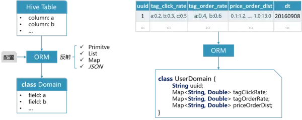 我们针对Hive开发了一套ORM库(见图8),主要基于Java反射,除了支持基本类型(int/long/float/double/String等),还支持POJO类型和集合类型(List/Map)。因为ETL不支持json拼接,为了兼容基于ETL统计的特征数据,我们的POJO以及集合类型是基于自定义的规范做编解码。针对Spark统计的特征数据,后续我们可以支持json格式的编解码。