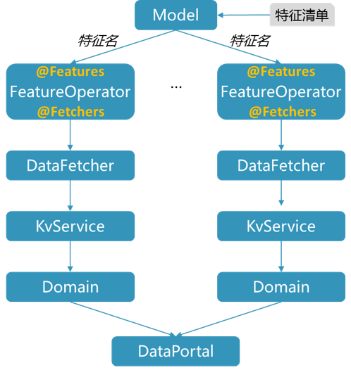 对于新特征,我们需要实现对应的FeatureOperator、DataFetcher。DataFetcher主要封装了Domain和DataPortal的关系。类似的,如果我们不需要以强类型的方式来保证代码的业务可读性,也可以通过优化框架省去DataFetcher和DataPortal的定制开发。