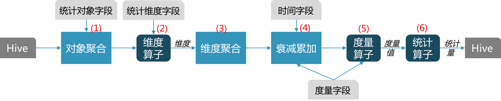 计算统计量。经过对象和维度聚合后,对象、维度、度量值建立了二级映射关系:对象维度度量值,相当于一个二维Map:Map<对象, map<维度,="" 度量值="">>。统计量是对Map<维度, 度量值="">做一个聚合操作。每个统计量对应输出Hive表中的一个字段。现在主要支持如下几种算子: