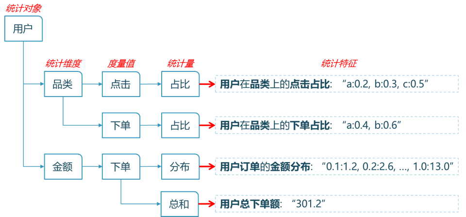 例如,对于用户点击品类偏好、用户下单品类偏好、用户下单额分布、用户下单总额等特征,可做范式分解: