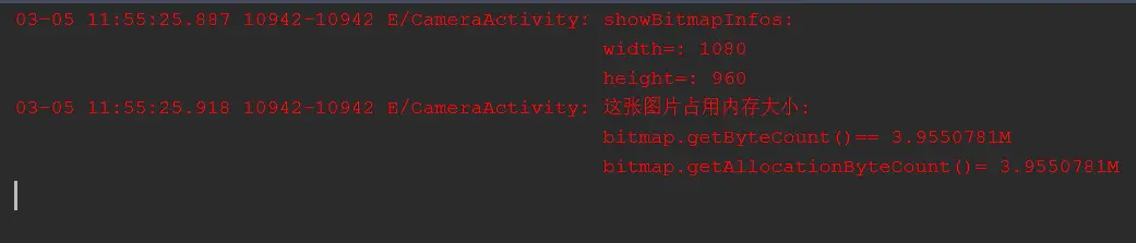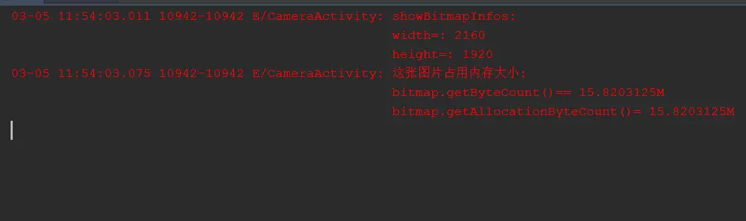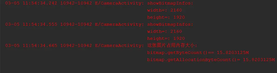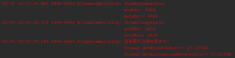 }我们希望将2160x1920像素的原图压缩到200x200 像素的大小,因此在getRealCompressedBitmap方法中,通过while循环inSampleSize的值最终为8,因此内存占用率将变为原来的1/64,这是一个很大的降幅。我们看一下日志,看看到底是否能够如我们所愿: