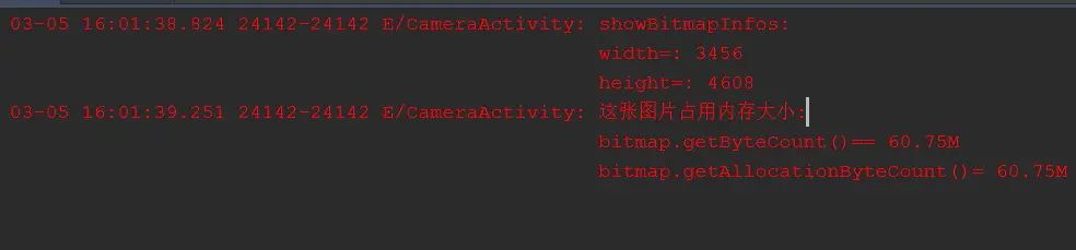 上面的日志,第一个showBitmapInfos 显示的是选择的图片通过BitmapFactory解析后的信息,第二个showBitmapInfos