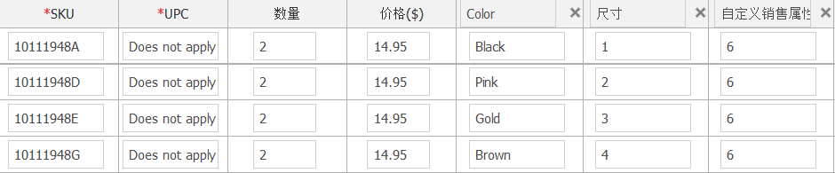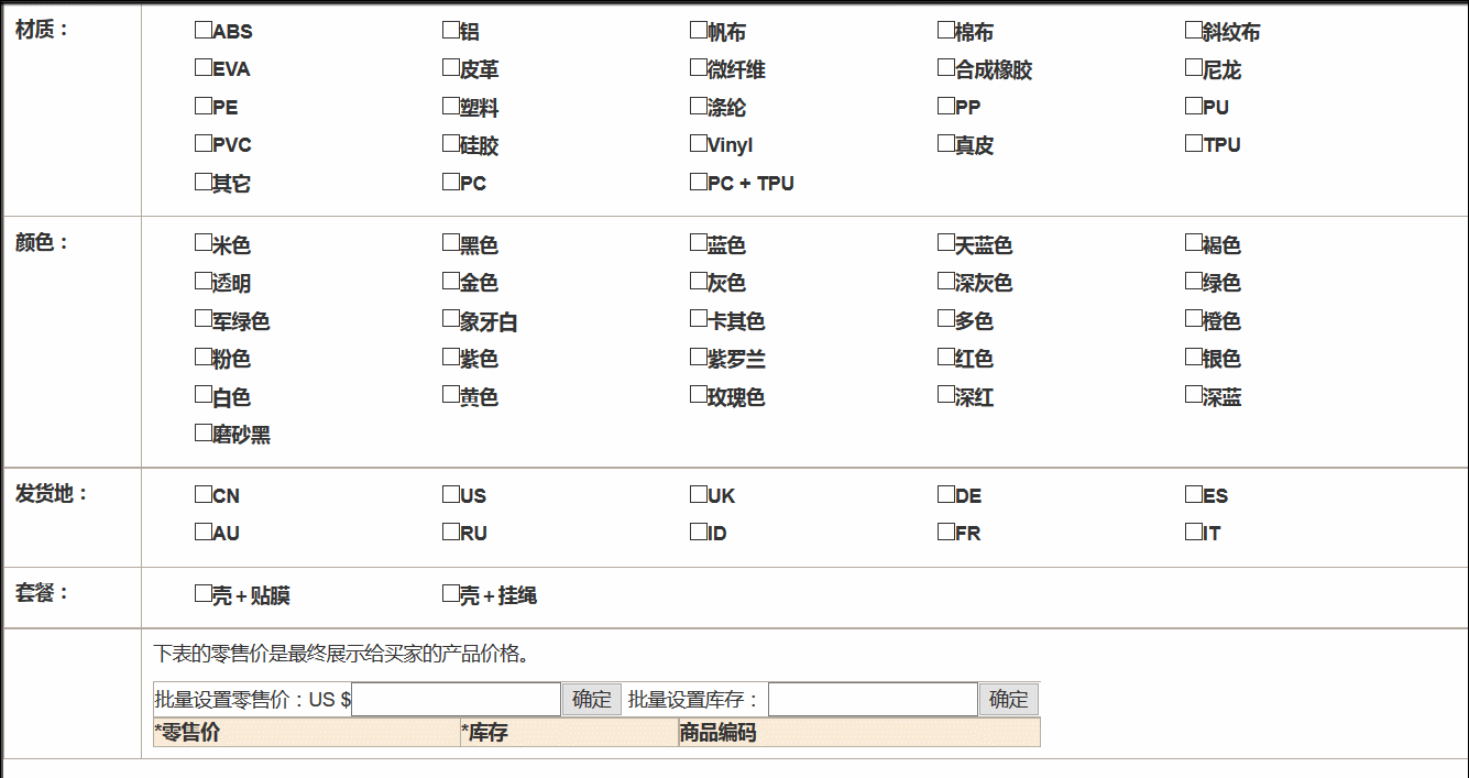 比较奇特,没有分类,产品有固定的属性,比如标题,描述,运费等。一个产品下可以有多个SKU,SKU的生成取决于固定的两大类属性,两个大类为:颜色和尺寸。比如颜色这个属性就是归类于颜色这个类,其他的属性(品牌,型号,容量等等归为尺寸这个大类)。尺寸类的属性值支持自定义,但只能选一个尺寸类属性(比如选了品牌就不能选容量,选了品牌后可以添加任意值)。两类属性不是必须同时存在,比如颜色选了红,可以不选尺寸类的属性,反之也一样。