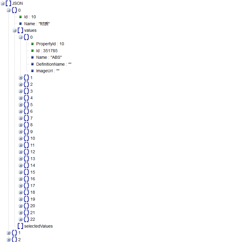 数据库大致就依靠上面的数据模型进行设计,编辑的时候,后端按照这些关联关系取出数据给到前端(我这边前后端未分离,页面还是后端渲染,但我还是把数据格式化为JSON再渲染到前端),保存的时候再进行相关的逻辑校验。因为后端的一些逻辑操作涉及后公司内部的业务,这里就不细说了。说说前端的具体细节,以速卖通的为例,用的是vue,前端拿到的数据如下