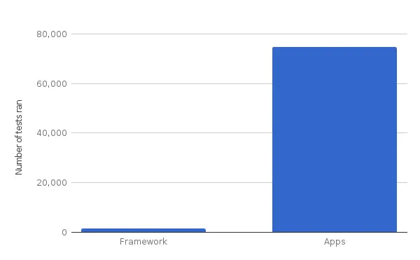 AngularDart 定义了 1601 个测试 (AngularDart 的测试)。但是当你在 Google 的仓库中提交了一份关于 AngularDart 的代码改动时,这个代码仓库就会让每一个依赖这个框架的 Google 员工执行测试。目前,一份提交大约有 7 万 4 千个测试(这取决于你提交的代码有多大的改动 —— 一种让系统知道你的代码不会造成影响的启发式测试)