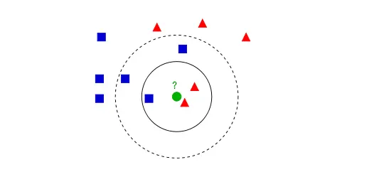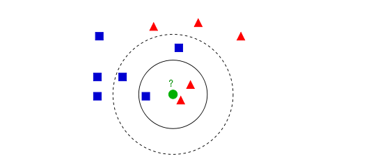 - 如果K=3,那么离绿色点最近的有2个红色三角形和1个蓝色的正方形,这3个点投票,于是绿色的这个待分类点属于红色的三角形。