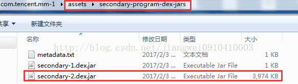 这里就阻碍住了,为何找不到这个类呢?在之前的一篇文章中已经踩过这个坑了,就是WX应用进行了拆包技术,就是有多个dex文件,不了解的可以看这篇文章:如何获取WX应用的聊天记录和通讯录信息;他把从dex放在assets目录下: