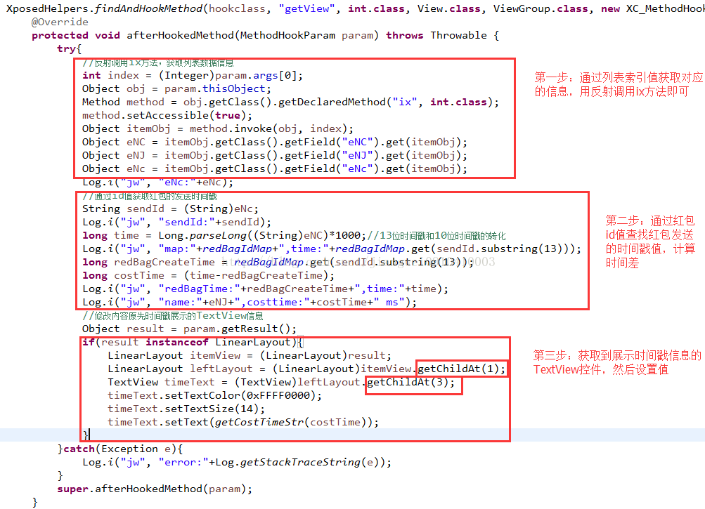 这里为了更好的在界面上看到每个人抢包时间,我们需要在修改列表信息,这时候我们可能需要去hook信息列表的getView方法了,我们知道每次展示item的时候都会调用getView方法的,看看getView方法的实现逻辑: