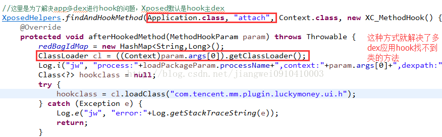 上面就分析完了红包详情页面数据信息,下面可以直接写Xposed模块,来hook这个方法即可,不过这里有一个坑需要注意的:Xposed默认是加载classes.dex主dex中的类。对于从dex中的类,按照以前方式加载的话会提示找不到类信息的,所以这里需要做一个处理,就是先hook系统的Application类的attach方法,然后得到对应的Context的类加载器,然后用这个类加载器去加载指定的类,如果找不到这个类就直接返回,因为无法知道想要加载类是在哪个dex中,而且你也无法知道当前hook的是哪个dex文件。所以只能一次一次进行尝试,一旦加载成功就开始后续的操作了,加载代码非常简单,如下所示: