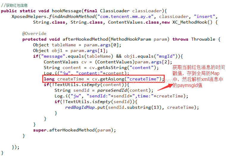 那么有了这些信息之后,我们应该还需要知道一个信息,那就是接受红包的时间戳和id值,这样我们才能计算每个人抢包的时间值。这个值获取也比较简单了,这个可以直接拦截消息,过滤是红包信息之后,解析xml信息得到对应的值,关于如何拦截消息在之前的一篇关于:如何自动打开公众号文章和链接文章 中已经详细介绍了,这里不再多说,直接上代码: