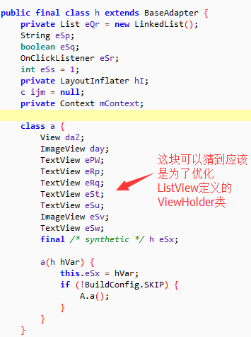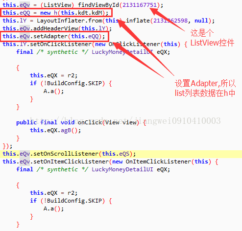 找到了ListView控件,要想看具体数据肯定要找到他的Adapter值: