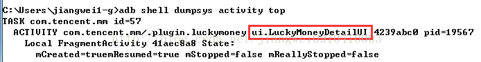 从这个详情页面可以看到,有一个值就是时间字段,而这个页面应该是个ListView控件,所以这里就是我们的突破口,这里依然使用命令查看当前页面名称:adb shell dumpsys activity top