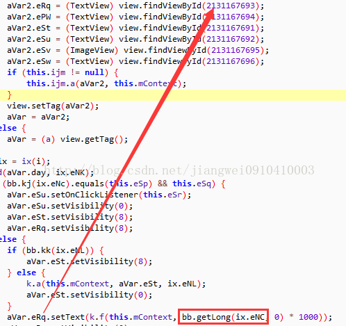 看到这里的布局层次是外层LinearLayout,然后内层第二个子View是LinearLayout,然后内部多个子TextView展示信息的,下面继续找到展示时间的TextView,这个也比较简单,因为从上面打印字段信息可以知道eNC这个值就是时间戳信息,可以查看代码:eRq就是展示时间戳信息的