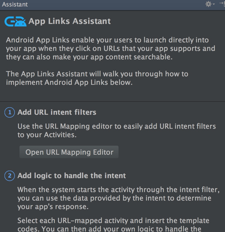 Android Studio 2.3及以上版本中提供了App Links Assistant协助开发者进行快速配置,该功能可在tools > App Links Assistant中开启。