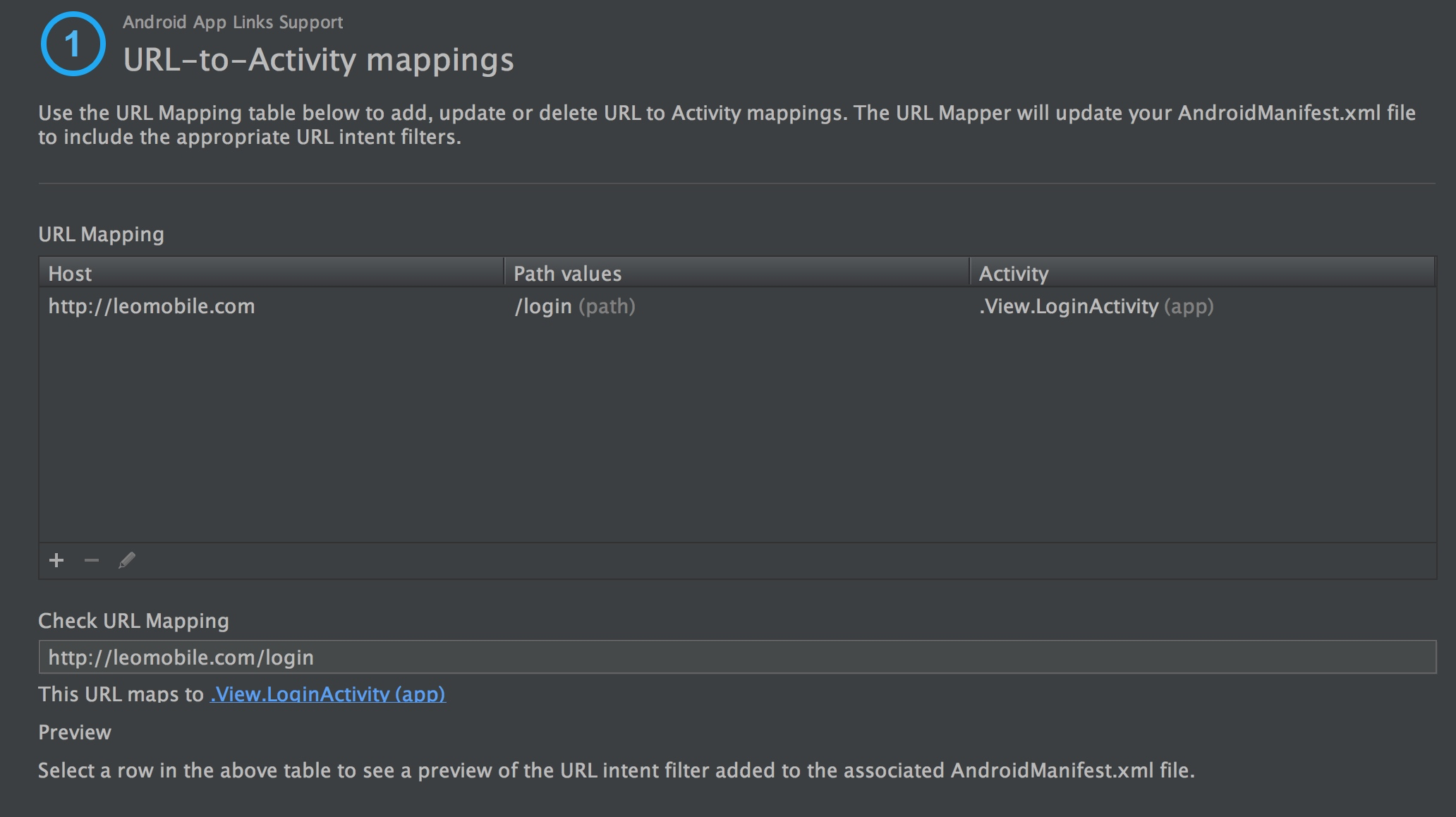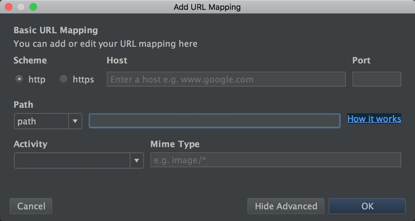 首先打开URL匹配规则编辑器,配置基本的Scheme、Host等信息,并指定关联的Activity对这块不是很了解的同学可以点击App Manifest了解各个字段的含义以及优先级。