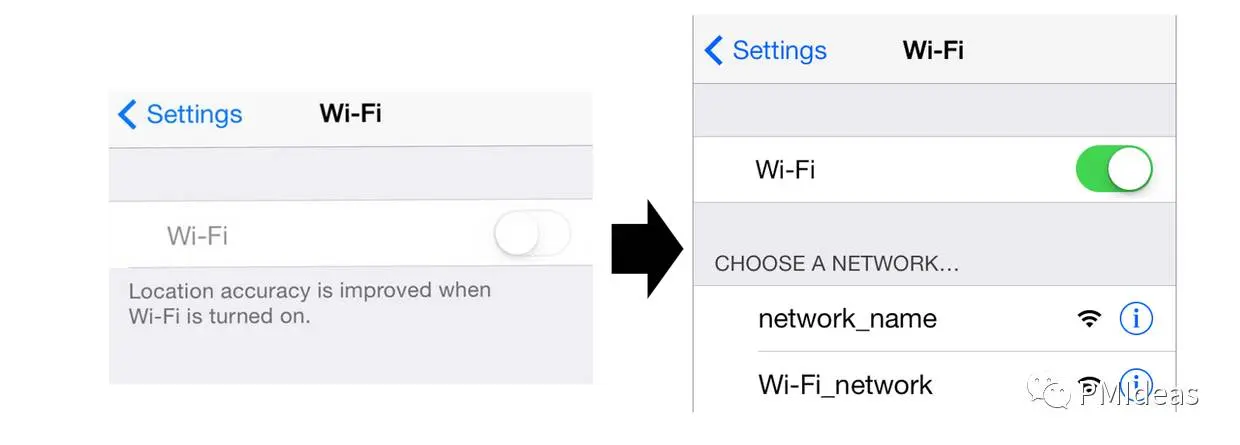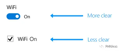 在下面的例子中,开关按钮很清晰的表明WiFi处于打开状态,而使用复选框则导致用户不得不去思考究竟当前的WiFi已经打开还是要取消选中后才对。