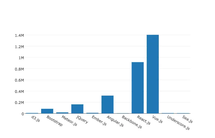 jQuery 份额不断下降,但她的使命已经完成。Vue.js 、React.js、Angular.js 形成三国鼎立之势。当然还有各种小虾小米,前端生态可谓鱼龙混杂。问题是,新技术、新框架层出不穷、日新月异,你学得过来吗?我的建议是学好基础,挑一个行情好的学,技术都是相通的。