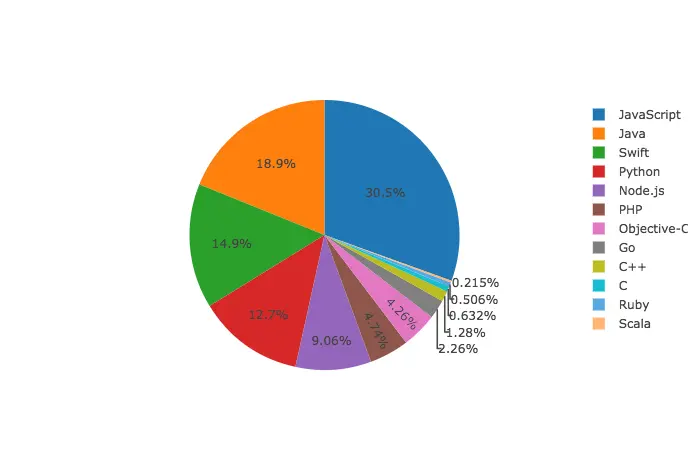 Swift 大步领先 Objective-C,这跟 TIOBE 的排名趋势基本接近。相信接下来 Objective-C 会进一步缩水,除了遗留系统之外,大家更愿意使用 Swift 进行新项目的开发。