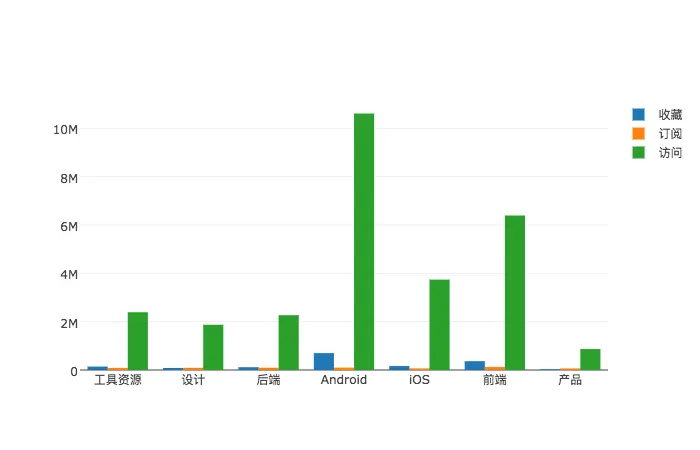 从访问量来看,社区 Android 开发者的体量是最大的,Android 访问量是 iOS 的两倍多。据艾瑞网统计 Android 手机的市场占比已经达到了86%,这就不奇怪了。 而后端就不那么给力了,无论是访问量还是收藏数都不高,一个侧面例子:我跟一做 Java 后端的朋友聊起掘金的时候,他表示没听说过掘金。所以掘金的运营同学要给力了,多拉点后端开发者来玩。