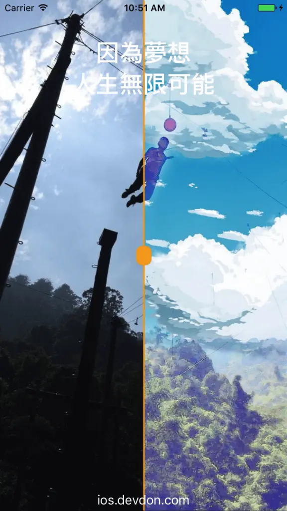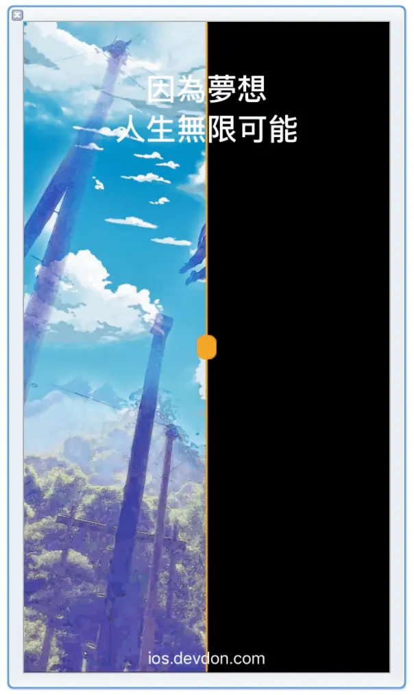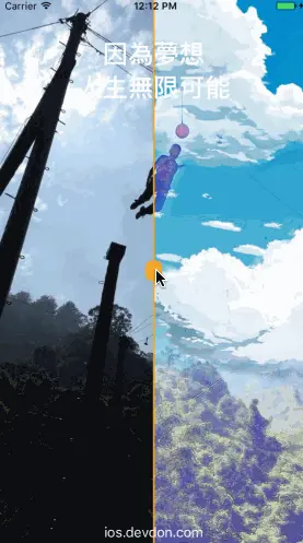 barImageView的寬度是25,所以中心點的x可以簡單算成12.5,當使用者拖動中間的bar時,我們改變barImageView以及遮罩層的寬度即可(讓他左側跟著barImageview)。