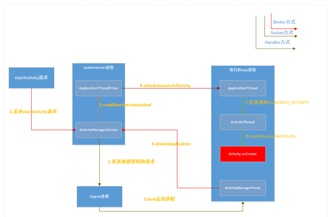 App进程的binder线程(ApplicationThread)在收到请求后,通过handler向主线程发送LAUNCH_ACTIVITY消息;