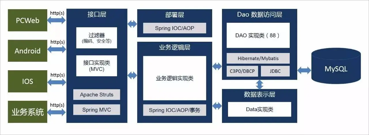 从技术角度看,原有系统是一个基于SSH架构的传统实现,软件架构整体上是大家所熟知的多层Java软件架构: