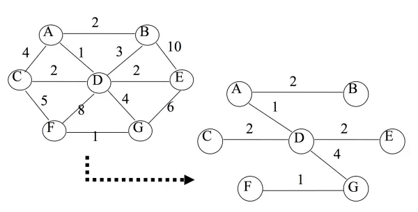 例如:要在 n 个城市之间铺设光缆,主要目标是要使这 n 个城市的任意两个之间都可以通信,但铺设光缆的费用很高,且各个城市之间铺设光缆的费用不同,因此另一个目标是要使铺设光缆的总费用最低。这就需要找到带权的最小生成树。