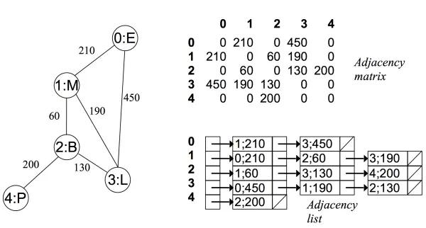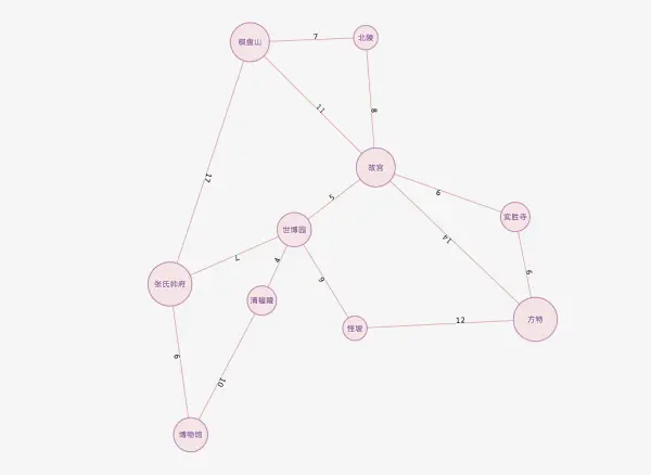 - 在一个有权图中,矩阵坐标中每个位置值代表该两点之间的权重,0 表示该两点不相连