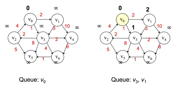 首先选取 v0 作为起始点,添加到优先队列中,将v0弹出,然后对 v0 邻接点进行判断,由于一开始所有边都为无穷大,那么 和 都更新,值为 2 和 1,按路径大小升序将v3、v1添加到优先队列。